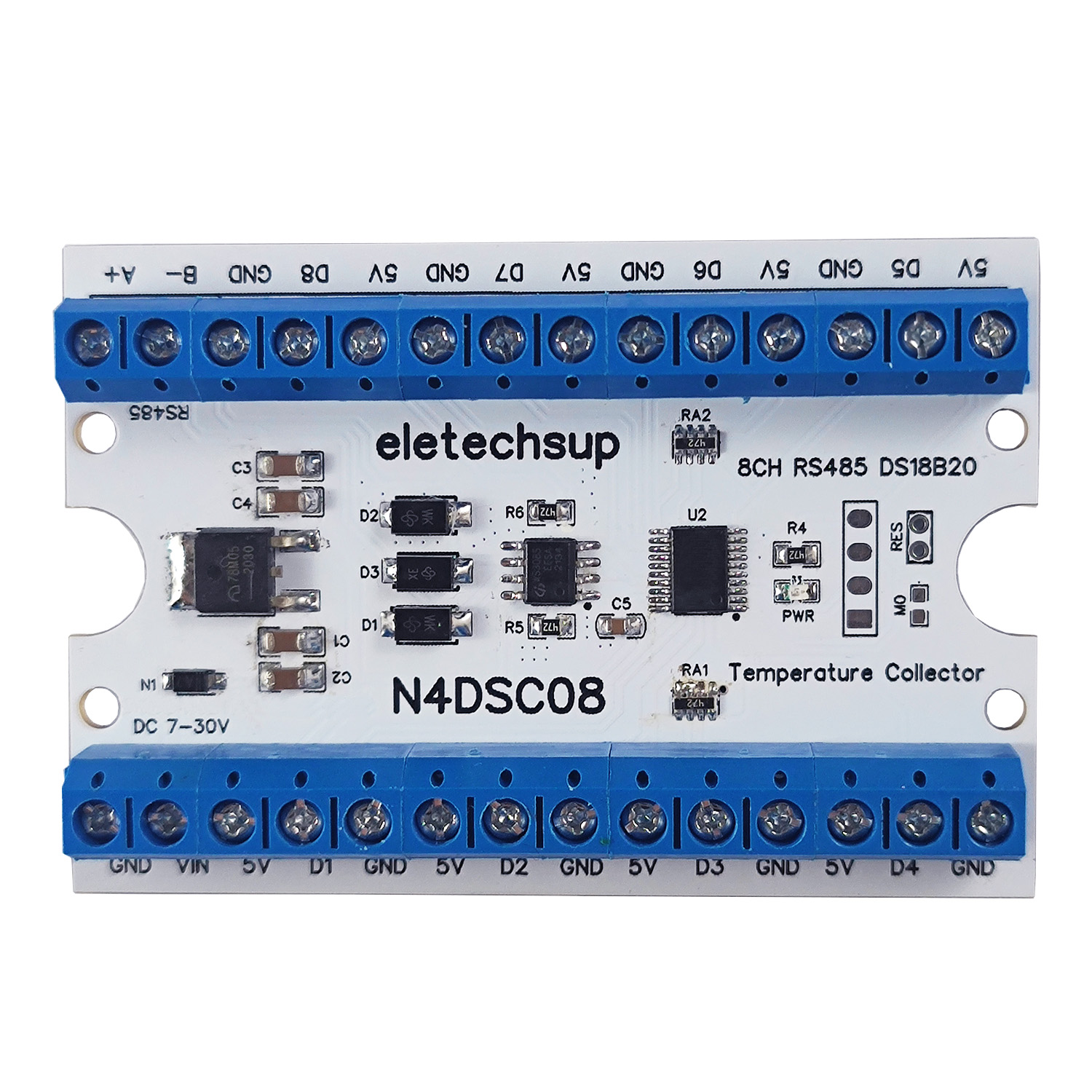 The N4DSC08 is an upgraded 8-channel RS485 DS18B20 temperature logger designed by eletechsup. Compared to the previous version, it features several improvements. For example, by configuring the ''Sensor probe mode'' register, it can adapt to sensors of varying lengths and specifications, making it compatible with DS18B20 sensors from a wider range of manufacturers.